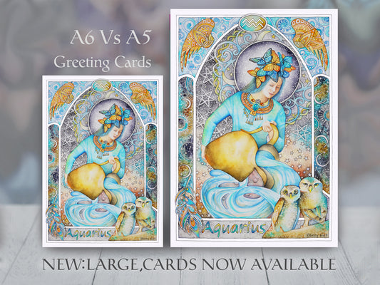 Aquarius Star sign Birthday Cards with Celestial Zodiac watercolor art