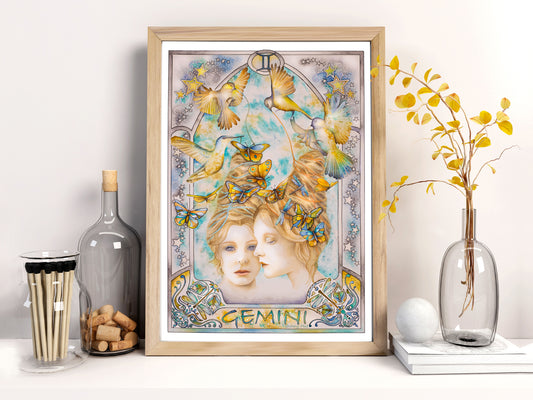 Gemini watercolor wall art prints, Zodiac Star Sign birthday gifts